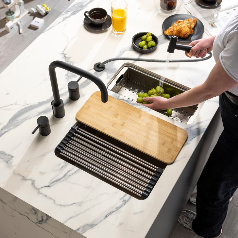 Meanwhile, sink systems can dispense drinks, drain food and wash dishes at the same time. Flexible over-the-sink boards and drainers save valuable worktop space and lever-handled taps are easy for fragile hands to flip on and off.