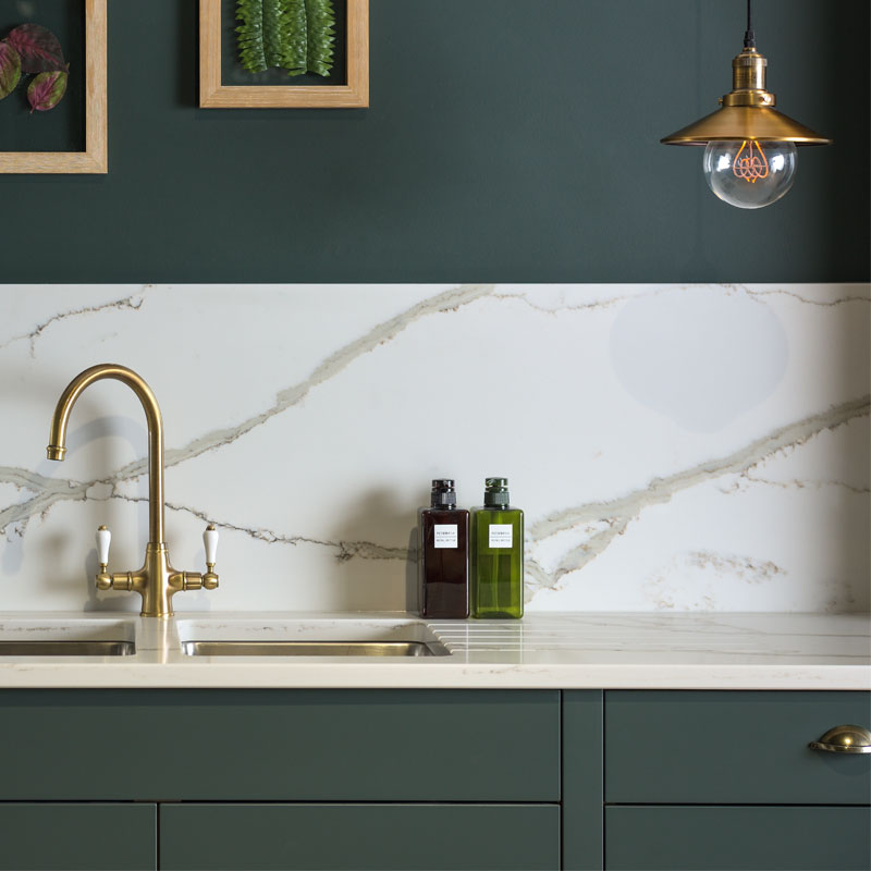 You can do it in a very straightforward way, through the use of a single colour or material. You could, for example, go for copper taps and cupboard handles coupled with a rail of copper pans and utensils. This theme can be enhanced with copper picture frames and light fixtures. This trick works equally well in traditionally-styled white kitchens and modern dark blue shaker kitchens. Alternatively, you may opt for matt-black taps, handles and sockets to match your matt-black appliances and bar stools. A choice that works well in industrial and monochrome kitchens.