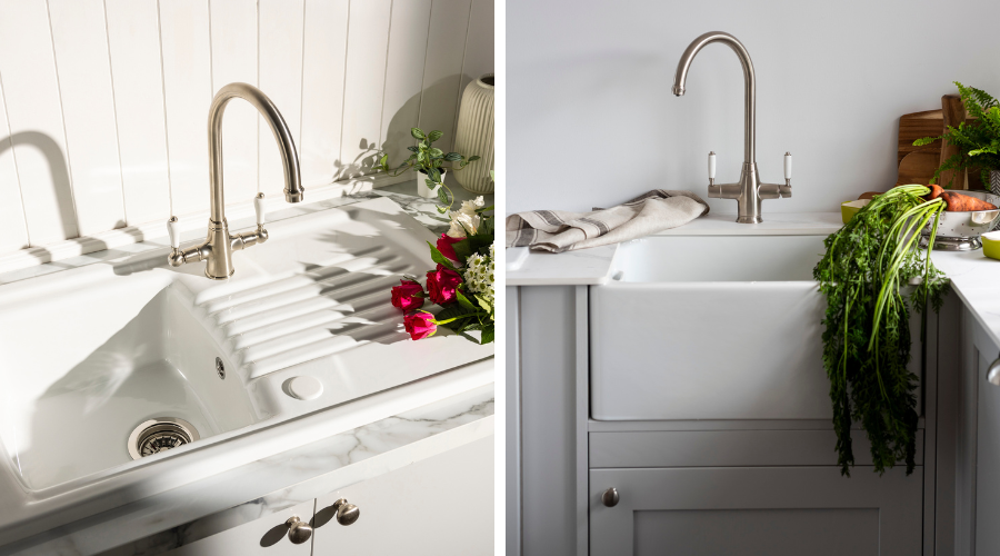 Clean-lined styles are popular with those looking for a more luxurious kitchen and those needing to maximise their space. Inset or low-profile sinks with deck-mounted taps and levers or spout-mounted handles tick all these boxes. They not only look the part but leave us more surface to play with, making them the ideal partner to a statement quartz, marble or stone worktop.